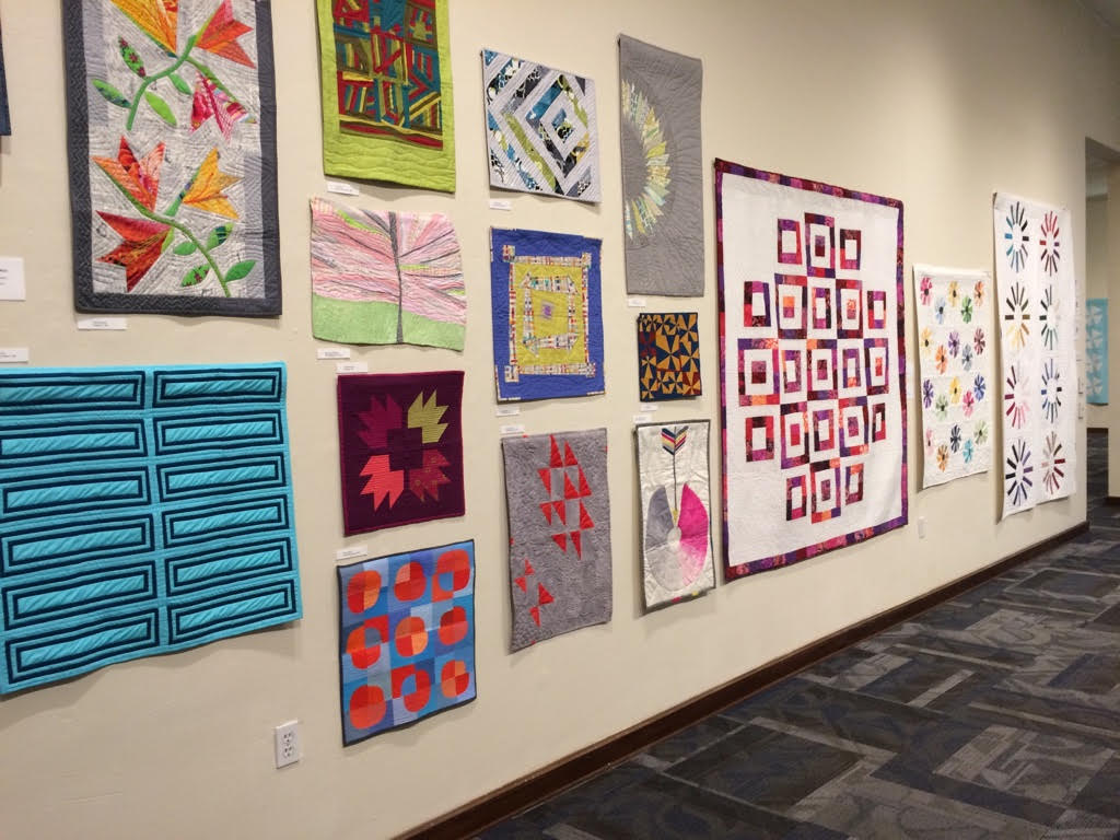 One wall of the exhibit “Modern Quilts: Redesigning Traditions.