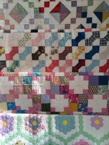 These quilts were all made by my husband’s grandmother c. 1960-1980. Each quilt is a masterpiece, entirely hand pieced and hand quilted. That are Treasures and I thank my sister in law for allowing us to be the caretakers of her two quilts. The Grandmothers Flower Garden pictured at the bottom was a gift when my husband I were married. In many ways, that quilt eventually set me on the path I am following today.