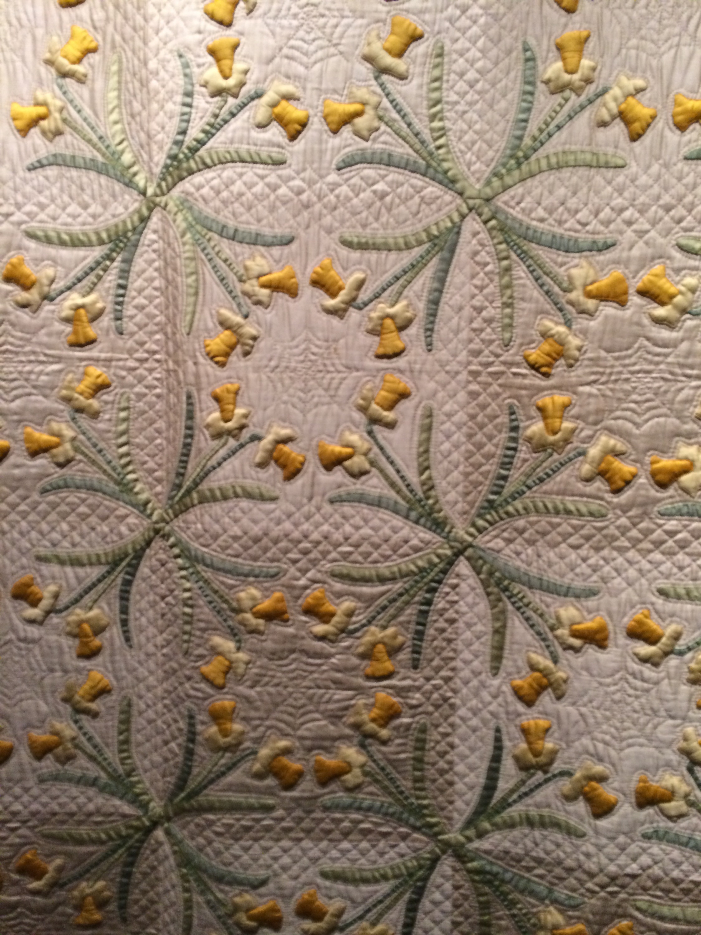 Look at that quilting! And the applique is stuffed! The pattern was originally published on the back of the label of the Mountain Mist Batting. The idea was when buying batting for your current quilt, you would also find a pattern for your next quilt! A brilliant marketing gimmick I wish they would do that today! And in fact, it is done… most fabric companies offer wonderful patterns free on their websites. Even I offer free patterns on my Craftsy site…