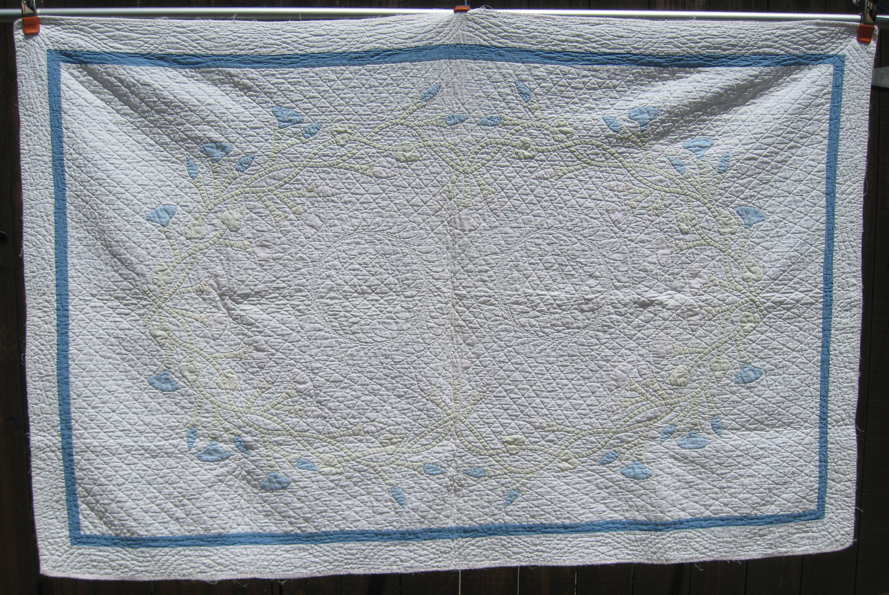 Ray unearthed this wonderful rendition of Marie Webster’s Morning Glories design early one morning at a SoCal Swap Meet. It is completely hand appliqued and marvelously hand quilted. Yes, it’s a bit faded (The green vine has morphed to a gentle khaki), but still a true gem!