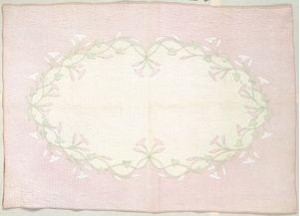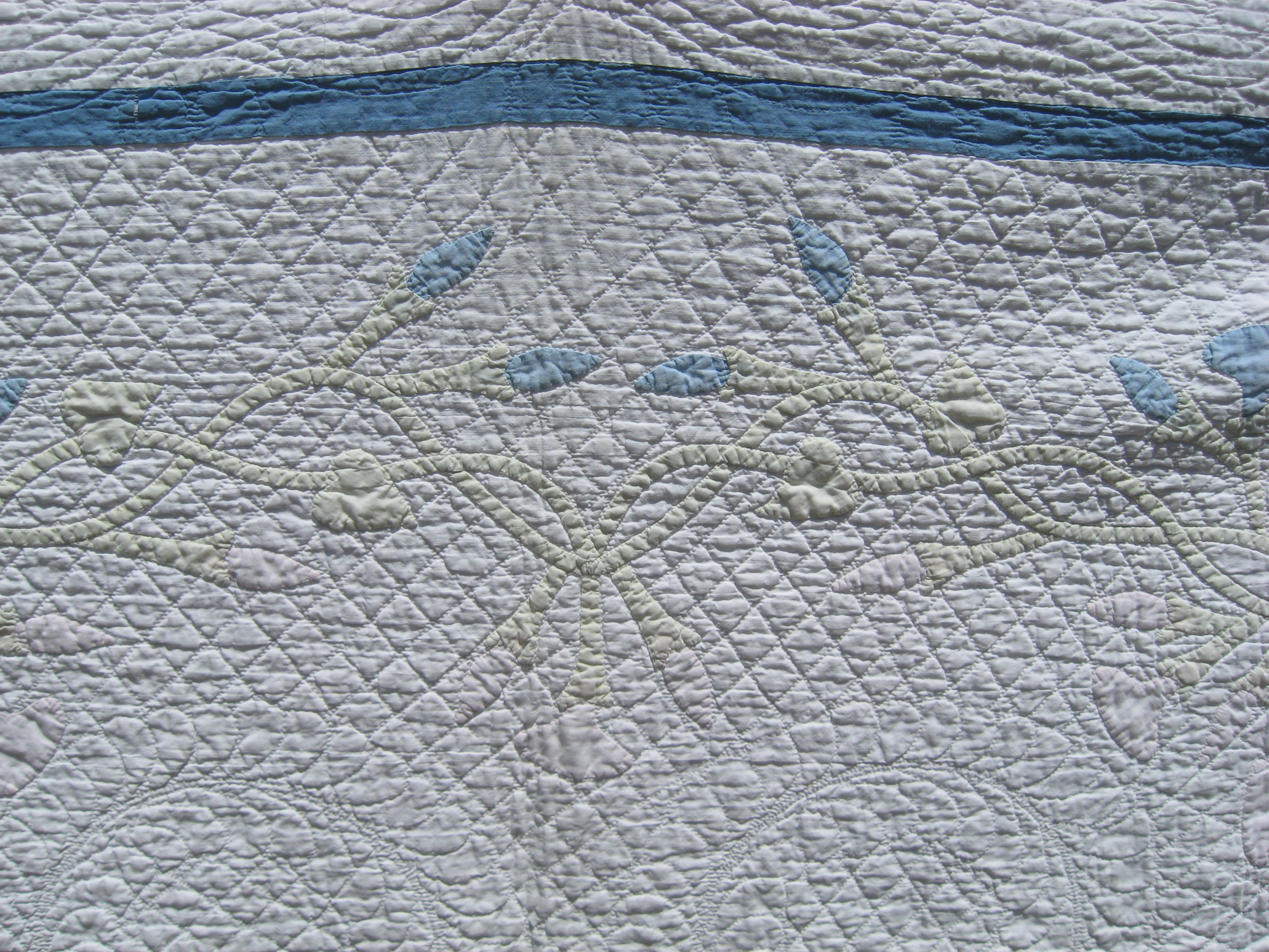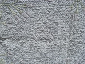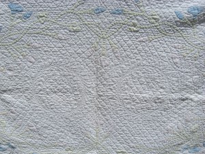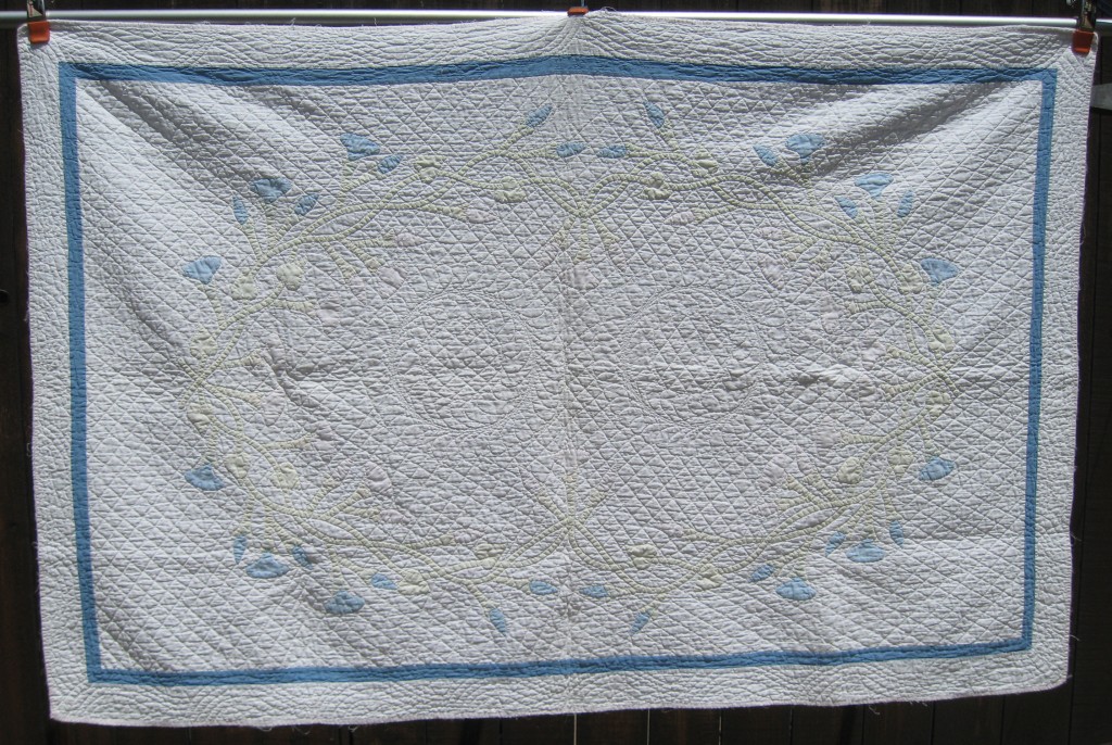 The quilt is child size, perhaps 40″ X 55″, with the morning glories arranged in an oval design. This may have even been from a kit! And the quilting….