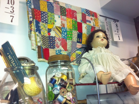 Well… they had this delightful antique doll quilt on display. See all those rectangles? I figure them at about 2″ x 3 1/2″ cut. This fits right into our doll quilt series so I’ll have to map something out and follow where this inspiration takes me! Of course, that array of fabrics really makes it! Probably some feed sacks. Makes my fingers itch to make it up! Watch out, I feel a pattern coming on so stay tuned.
