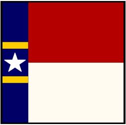 Flag: The flag of North Carolina consists of a blue union, containing a white star between the letters N and C in gilt. The circle containing the star is one-third the width of the union. The fly of the flag consists of two equally proportioned bars; the upper bar is red, the lower bar white. Above the star in the center of the union there is a gilt scroll in semi-circular form, containing in black letters this inscription “May 20th, 1775”, and below the star there is a similar scroll containing in black letters the inscription: “April 12th, 1776”.