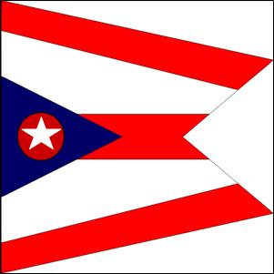 Ohio’s state flag was adopted in 1902. The Ohio burgee, as the swallowtail design is properly called, was designed by John Eisemann. The large blue triangle represents Ohio’s hills and valleys, and the stripes represent roads and waterways. The 13 stars grouped about the circle represent the original states of the union; the 4 stars added to the peak of the triangle symbolize that Ohio was the 17th state admitted to the union. The white circle with its red center not only represents the “O” in Ohio, but also suggests Ohio’s famous nickname, “The Buckeye State”.